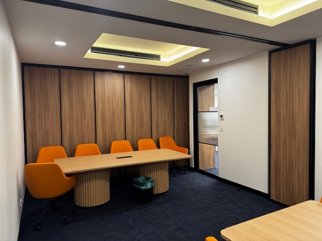 The completed fitout offers staff a flexible, acoustically controlled environment that supports both focused meetings and large collaborative gatherings. The natural timber-look finish creates a welcoming workplace atmosphere while maintaining durability and long-term performance.